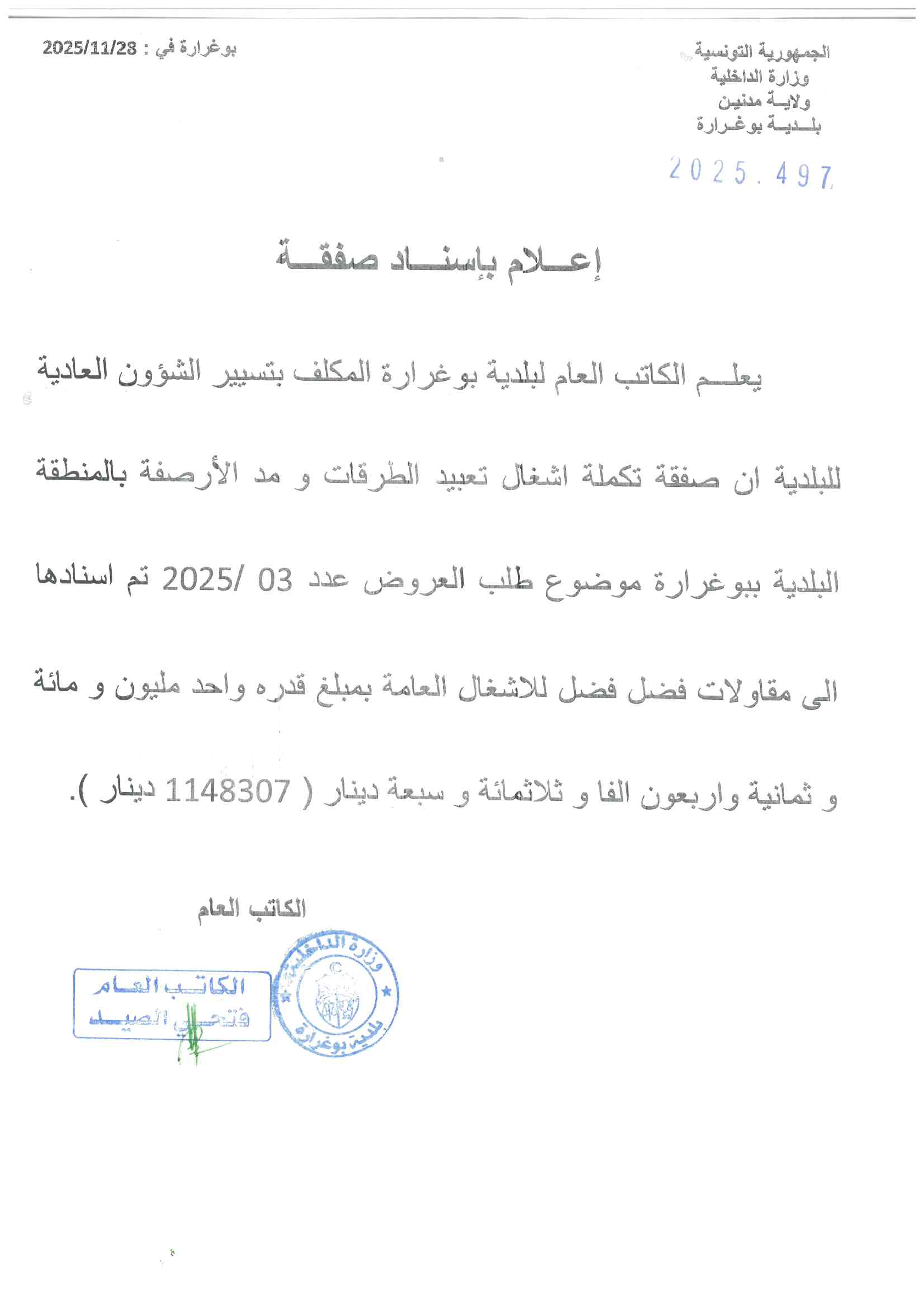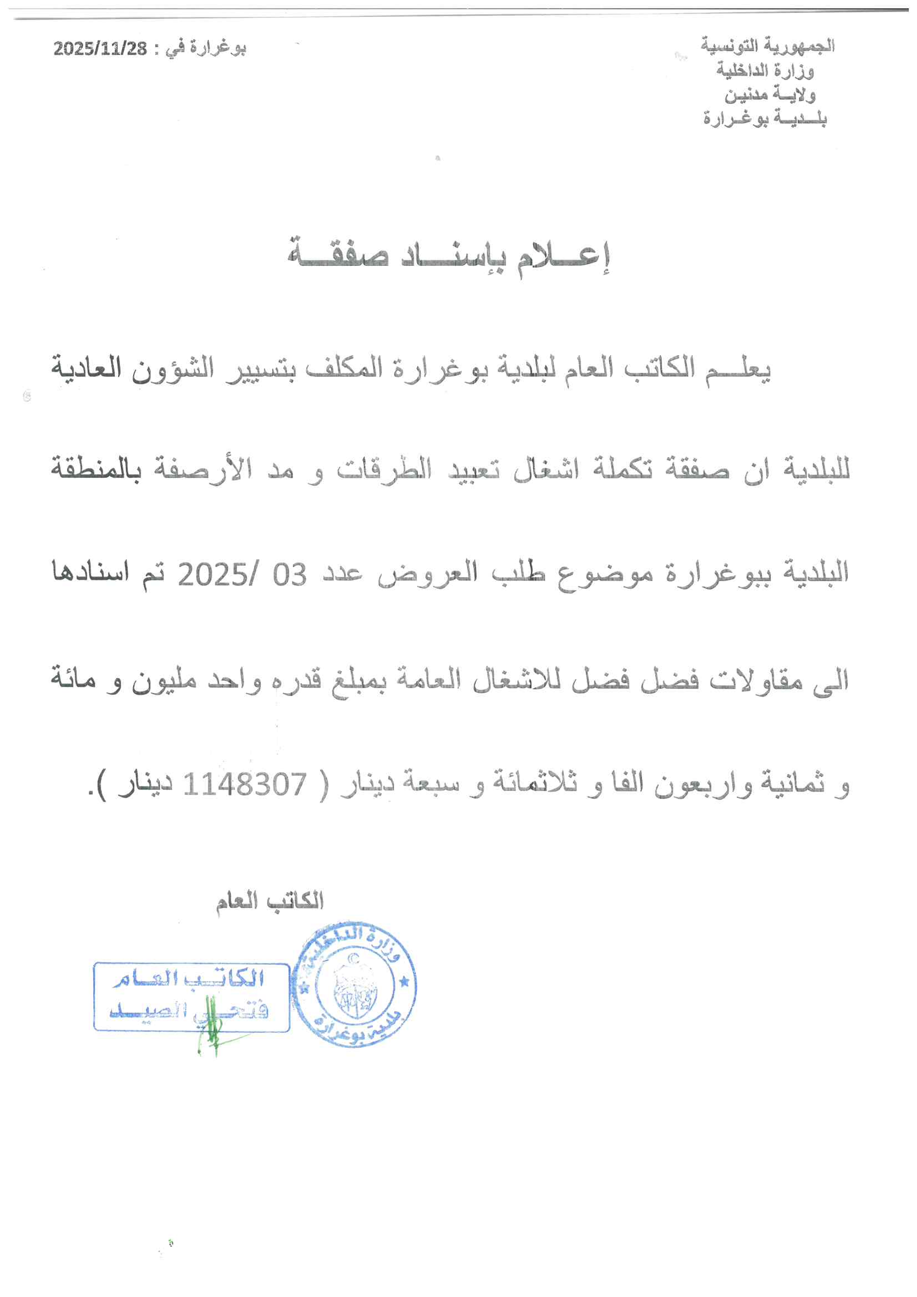 طلب عروض عدد 2025/03 تتعلق بإنجاز تكملة أشغال تعبيد الطرقات و مد الأرصفة بالمنطقة البلدية ببوغرارة
