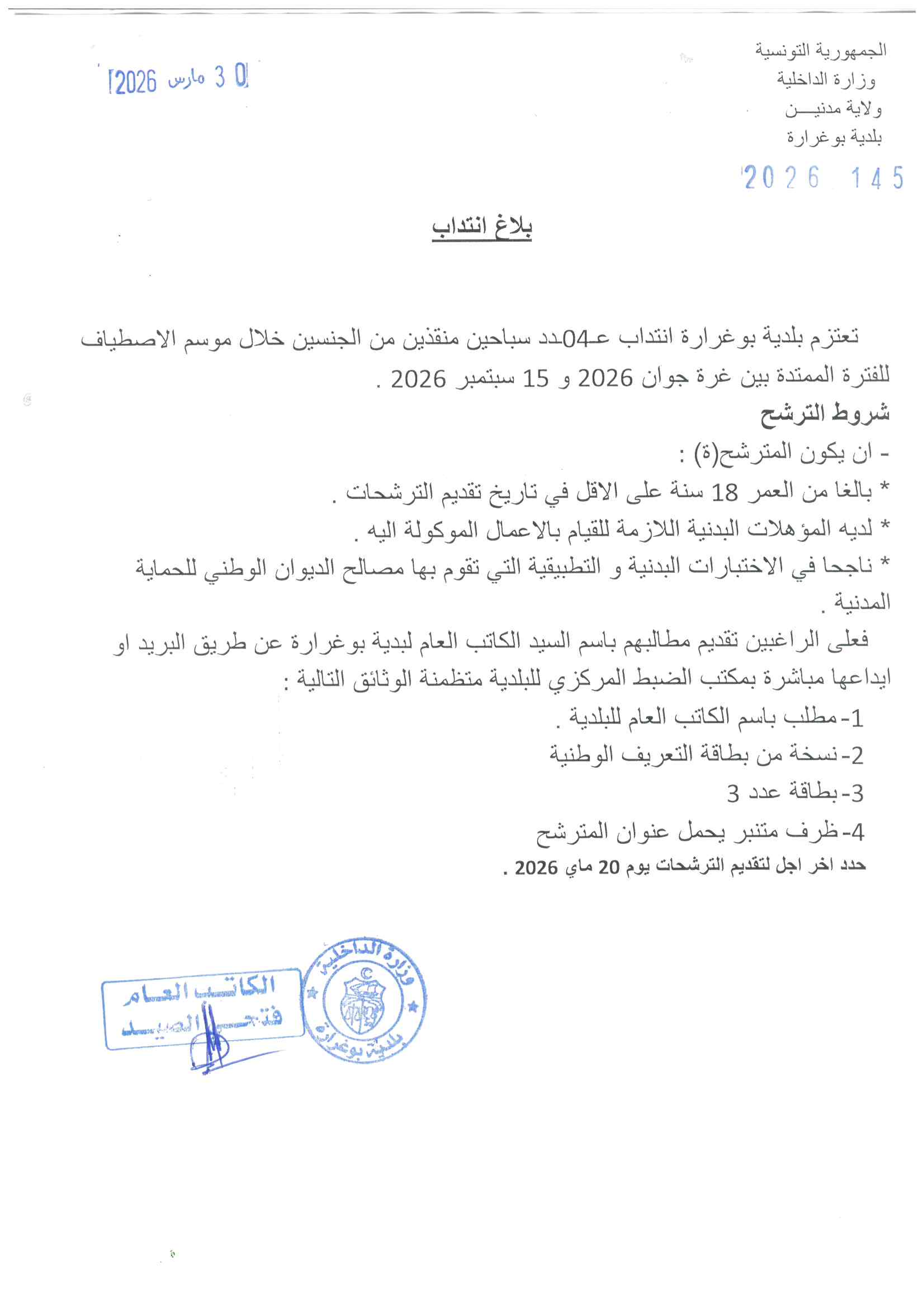 بلاغ انتداب عدد 04 سباحين منقذين خلال موسم الاصطياف للفترة الممتدة بين جوان 2026 و 15 سبتمبر 2026